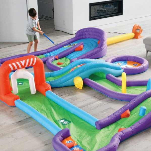 Piepūšamais mini golfs, aktivitāte bērniem, lietošanai iekštelpās vai ārā. Nepieciešama elektrība. Atrakcijas izmērs: 3,7 x 3m un 65cm augsts.NOMAS CENA:
